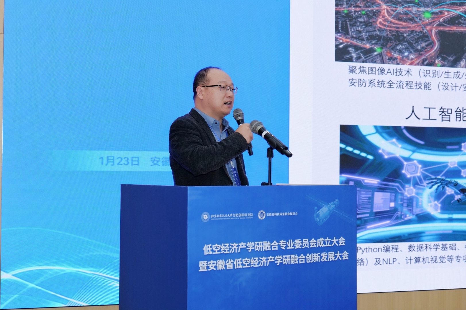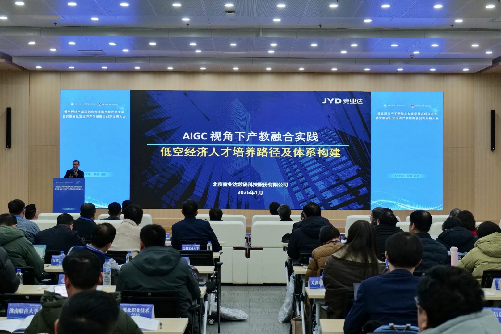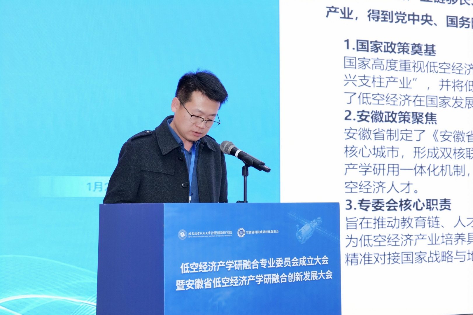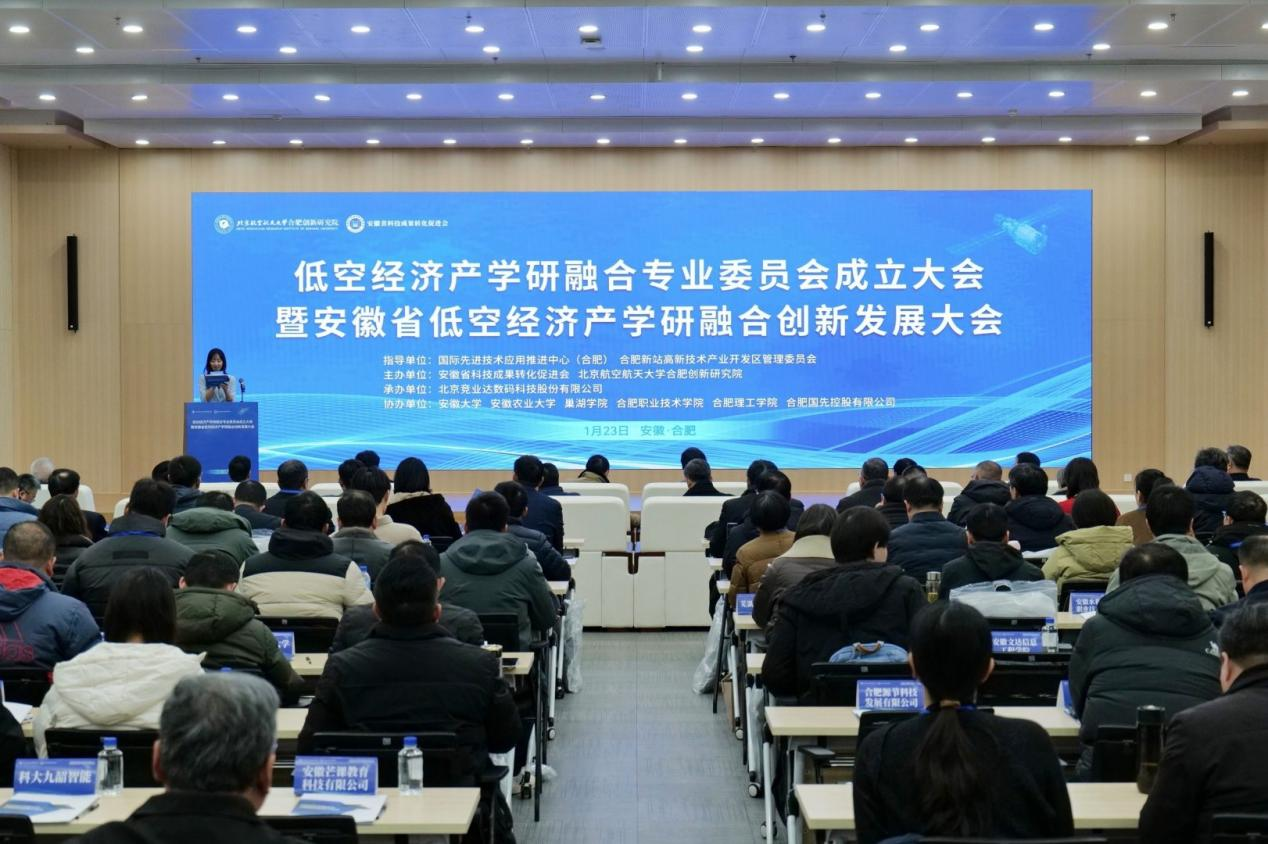 1月23日,我院与安徽省科技成果转化促进会共同主办的“低空经济产学研融合专业委员会成立大会暨安徽省低空经济产学研融合创新发展大会”顺利举行。本次大会得到国际先进技术应用推进中心(合肥)、合肥新站高新技术产业开发区管理委员会的大力支持,由北京竞业达数码科技股份有限公司承办,并联合省内高校及多家产业链企业共同协办,体现了研究院在推动区域产业协同与资源共享方面的平台作用。作为会议主办方与专委会重要发起单位,研究院积极搭建协同创新平台,汇聚两百余位政、产、学、研各界代表,共同推动低空经济领域教育链、人才链与产业链、创新链深度融合,助力安徽抢占低空经济发展先机。